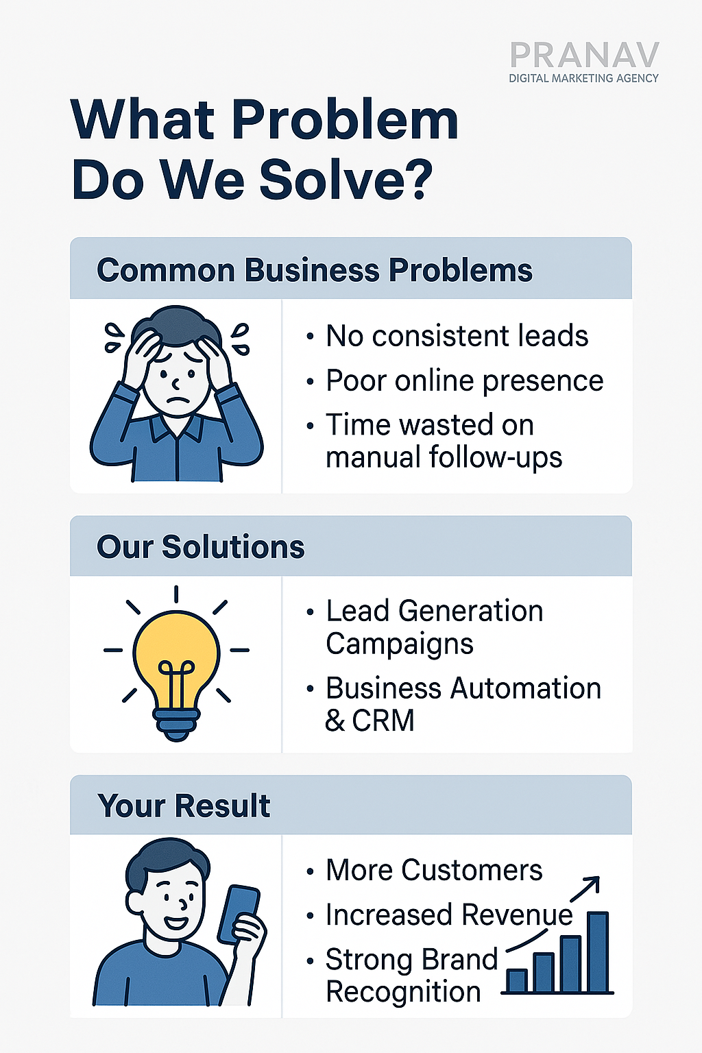 Pranav Digital Marketing Agency helps businesses overcome the challenges of low online visibility, poor lead generation, and inefficient customer management. Many businesses struggle with reaching the right audience, converting leads into customers, and managing their sales and marketing processes effectively. We solve these problems by implementing data-driven digital marketing strategies, automating business operations, and integrating CRM solutions to streamline workflows. Our goal is to help businesses attract quality leads, nurture customer relationships, and achieve sustainable growth.